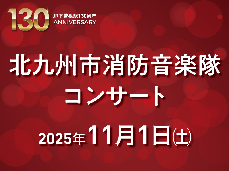 JR下曽根駅130周年を記念し、北九州市消防音楽隊による演奏と、カラーガード隊による華やかなパフォーマンスを行います。一緒にJR下曽根駅130周年をお祝いしましょう。ぜひ皆さまで...
