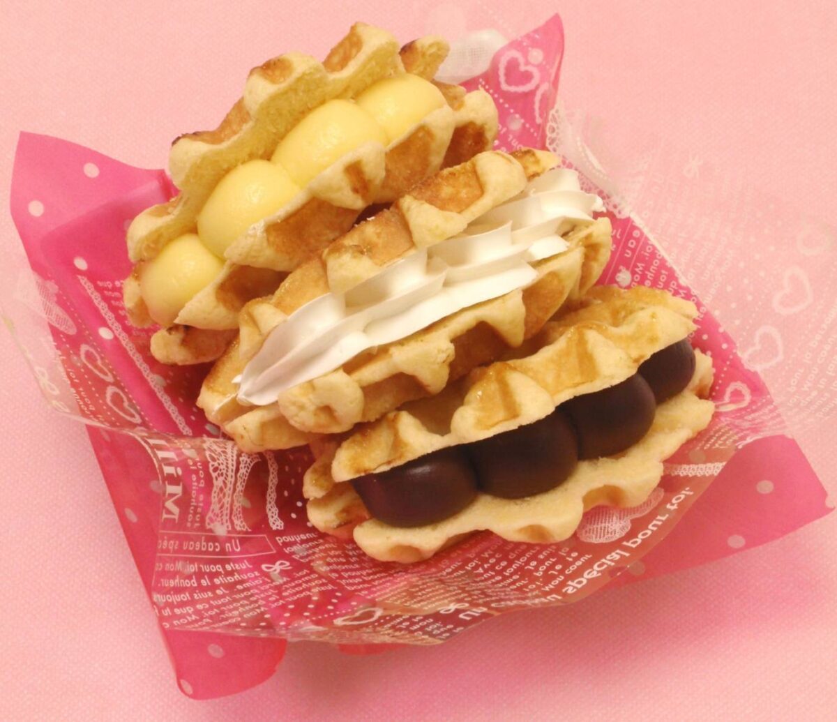 やさしい甘さのワッフルに、カスタード・生クリーム・チョコレート・いちごなどをトッピング。