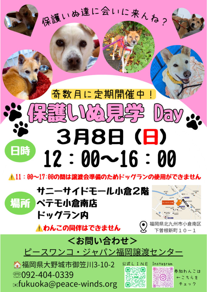 日時:3月8日(日) 12:00~16:00場所:サニーサイドモール小倉2階 ペテモ小倉南店ドッグラン内 ※当日11:00~17:00はドッグランの利用ができません...